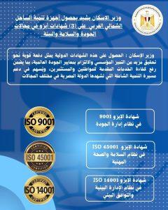 أشاد المهندس شريف الشربيني، وزير الإسكان ، بحصول أجهزة تنمية الساحل الشمالي الغربي على (3) شهادات أيزو في مجالات الجودة والسلامة والبيئة ، وهي ISO 9001 في نظام إدارة الجودة،ISO 45001 فى نظام السلامة والصحة المهنية،ISO 14001 فى نظام الإدارة البيئية والتوافق البيئي.