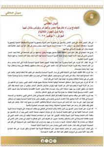 1- في إطار الحرص الدائم على تعزيز التشاور والتنسيق بين جمهورية مصر العربية والجمهورية الجزائرية الديمقراطية الشعبية والجمهورية التونسية، استضافت الجزائر يوم 6 نوفمبر 2025 اجتماعا لوزراء خارجية الجزائر وتونس ومصر في إطار آلية دول الجوار الثلاثية قصد التباحث بشأن آخر تطورات الأزمة في دولة ليبيا.