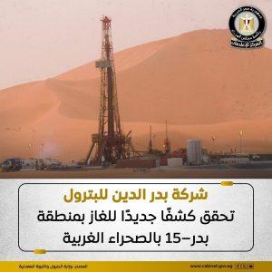 في إطار نتائج إجراءات تحفيز الاستثمار التي تنفذها وزارة البترول والثروة المعدنية لزيادة الإنتاج تدريجيًا وتقليل الاستيراد، أعلنت الوزارة عن تحقيق شركة بدر الدين للبترول كشفًا جديدًا للغاز بمنطقة بدر–15 بالصحراء الغربية من خلال البئر BED 15-31.