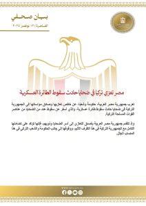 تعرب جمهورية مصر العربية، حكومةً وشعبًا، عن خالص تعازيها وصادق مواساتها إلى الجمهورية التركية في ضحايا حادث سقوط طائرة عسكرية، والذي أسفر عن سقوط عدد من الضحايا من عناصر القوات المسلحة التركية.