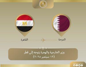 توجه د. بدر عبد العاطي وزير الخارجية والهجرة وشئون المصريين بالخارج يوم ١٣ سبتمبر إلى العاصمة القطرية الدوحة، للمشاركة في الاجتماع الوزاري التحضيري للقمة العربية الإسلامية المشتركة الطارئة لبحث الهجوم الإسرائيلي على دولة قطر الشقيقة.